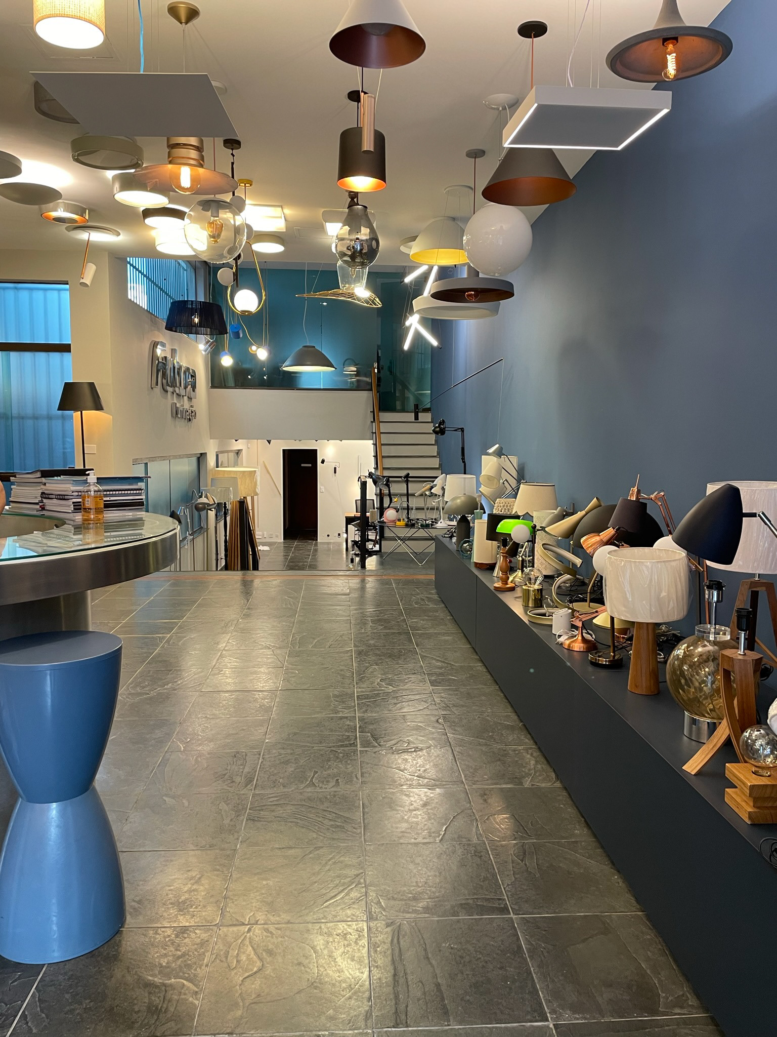 Now located at Rua Artur de Azevedo 1301, the store mood was reinvented, the facade blue now is inside the store, in a huge wall changing completely the lamps exhibition, creating a lot of contrast and transforming the clients experience.